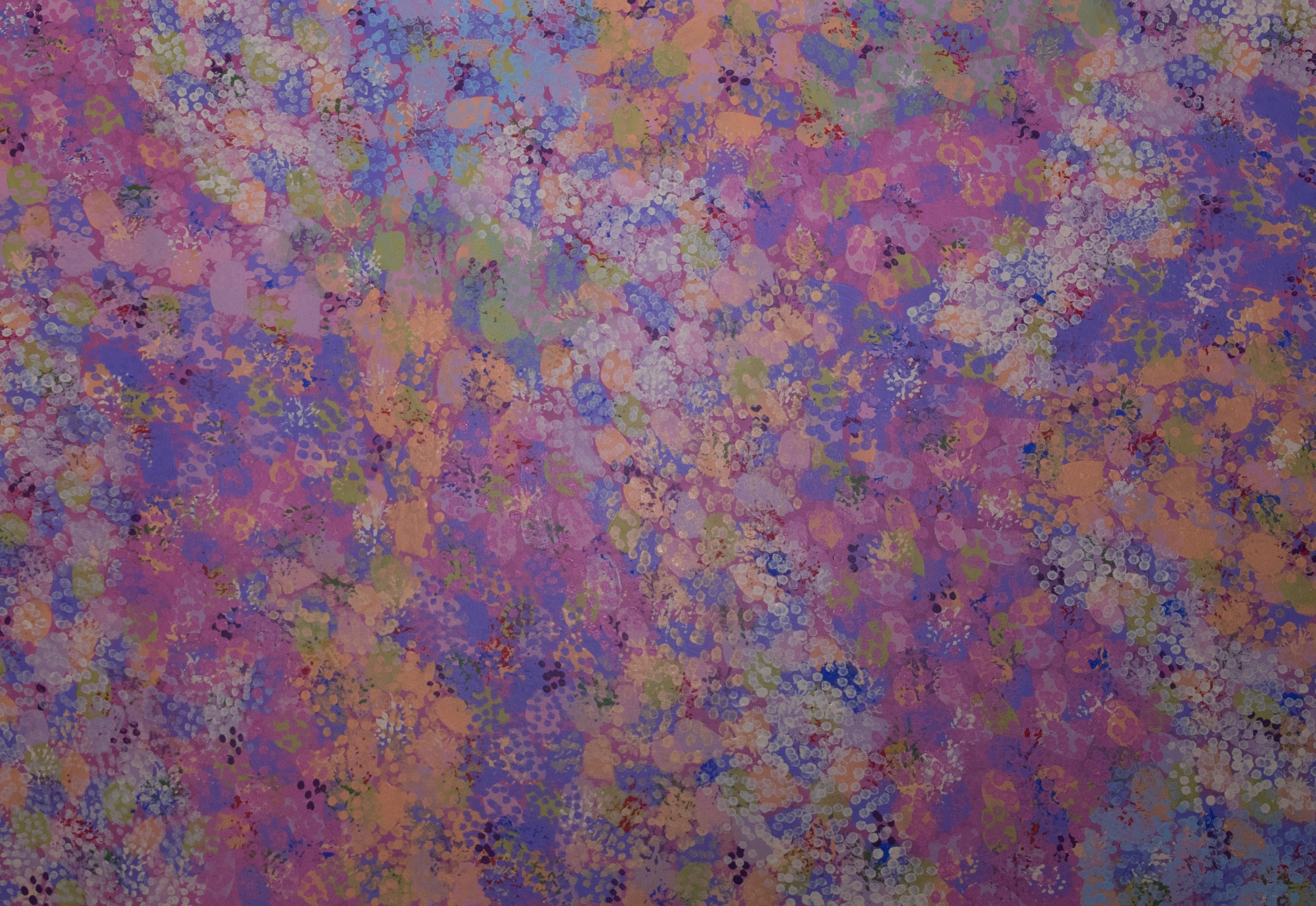 Springtime is a beautiful blending of colours in our country. After the rain all the wild flowers come up in a pattern like a puzzle. The artist often sponges her background using colours which include Red, Pink, Yellow’s and Orange. She painted over this background with her own unique style and bright colours. As in much aborigional art the artist has represented her country from an aerial perspective.