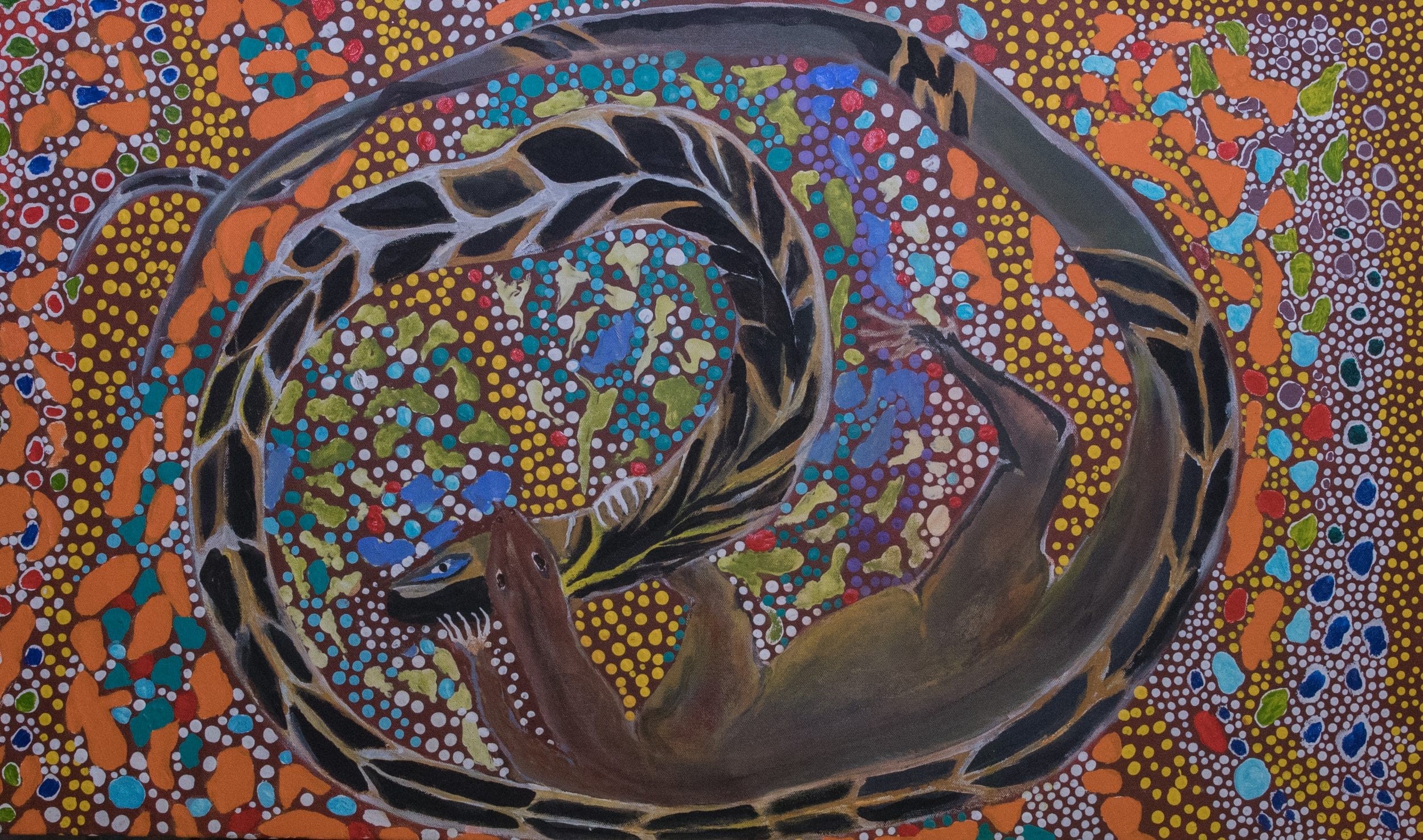 The goanna gets poisoned by the snake. He runs to the tree for bush medicine ad gets better and runs back to kills the snake.