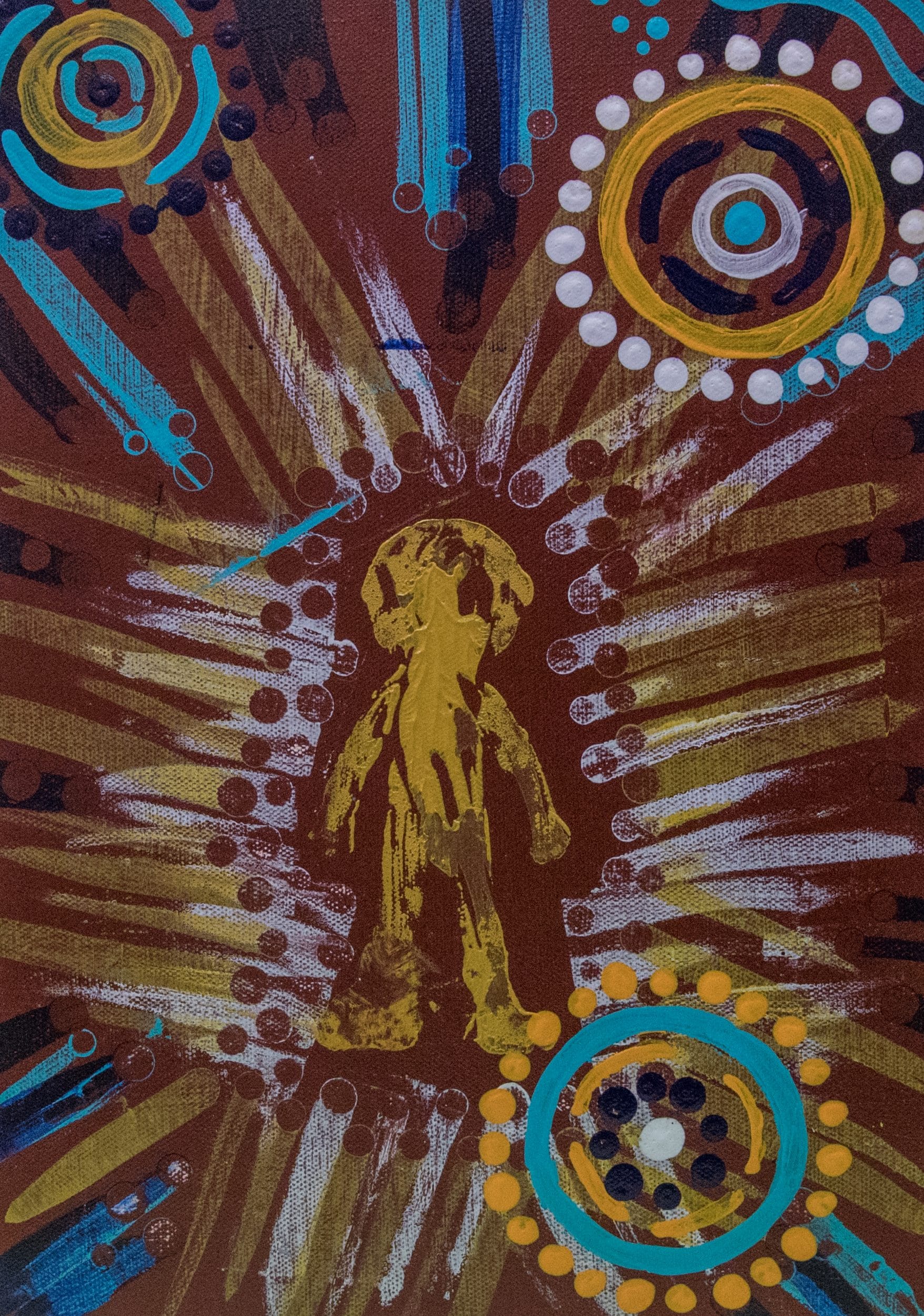 This piece represents my re-connection to my family and country after being one of the last of the stolen generation. It is all about coming together, getting to know my family, my culture and my country. Ngarluma country and culture.