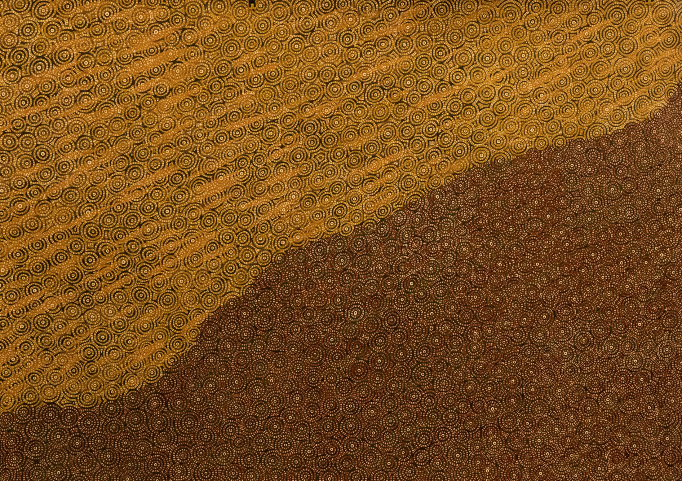 Family mob went out on country hunting for bush tucker. We travelled along the coast on Ngarluma Ngurra, across the Barlgarra searching for Kangaroo. The circles are the baru-ngarli (spinifex) and the colours are of the red dirt meeting the sea-side sand.
