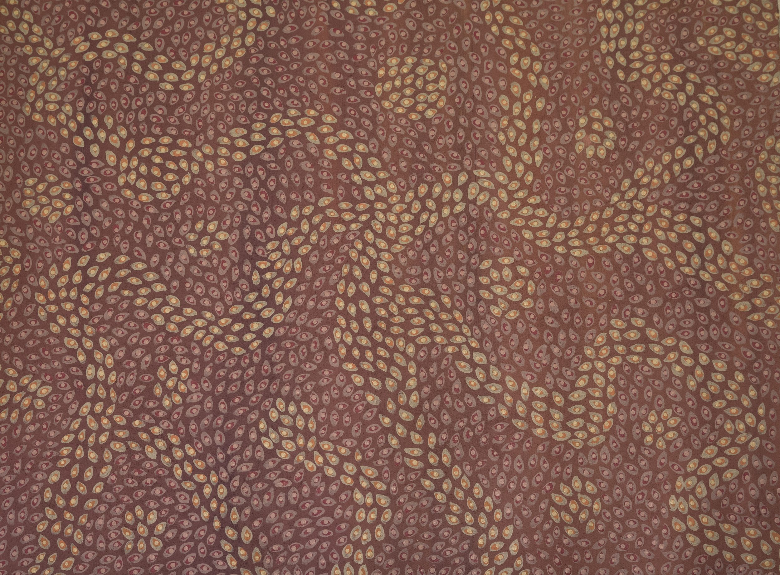 This is the Fortescue Mulla Mulla, Gumbarli in Yindjibarndi language. The flower is a purplish colour. Not a bush medicine, just a flower that grows in the country, in lines along the roads, everywhere. In this painting, the seeds of the Mulla Mulla are all blowing out. Once the leaves and petals have fallen off, the seeds are blown all through the land to bring flowers again next year.