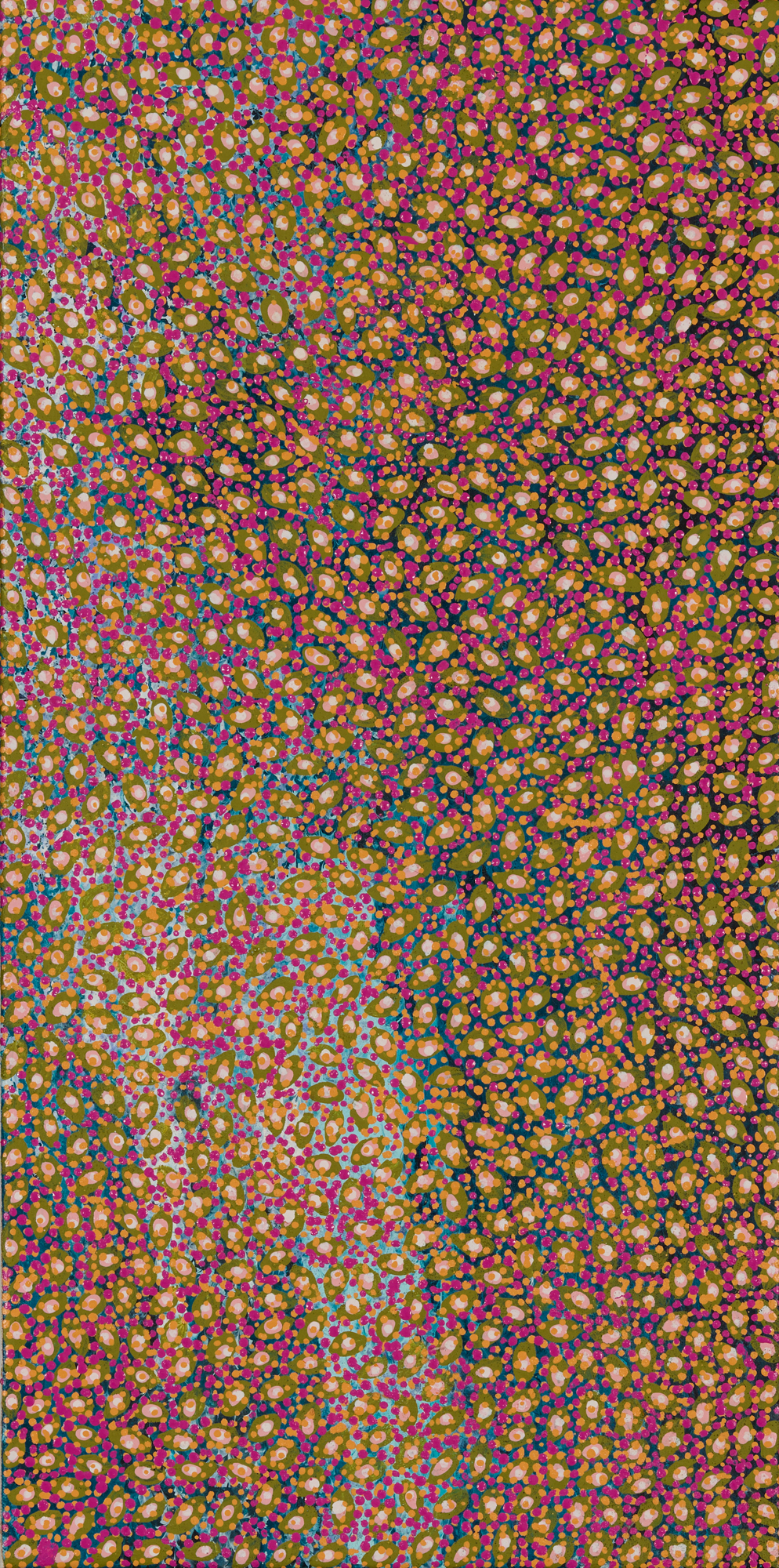 This is the Fortescue Mulla Mulla, Gumbarli in Yindjibarndi language. The flower is a purplish colour. Not a bush medicine, just a flower that grows in the country, in lines along the roads, everywhere. In this painting, the seeds of the Mulla Mulla are all blowing out. Once the leaves and petals have fallen off the seeds are blown all through the land to bring flowers again next year.