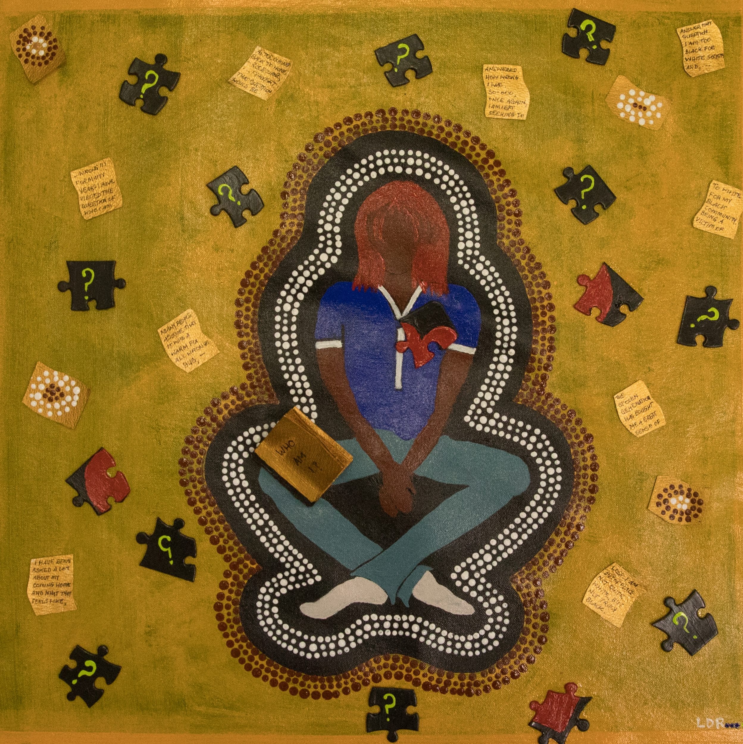 Having returned to my ancestral and cultural home – Ngarluma Ngurra, I have been asked one question often, ‘What is it like to be home?’. With that question comes the assumption that it will fix any issues I may have, that would be wrong. People also assume I am playing a victim – WRONG, I am a SURVIVOR. this piece represents just a little of the confusion, questions and complexity of what it is for me to be part of the ‘stolen generation’, and the ongoing impact of that. There are so many layers that still require clarity.