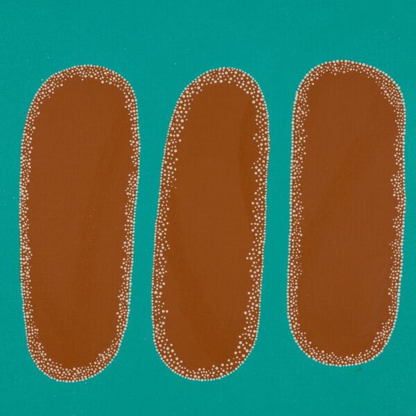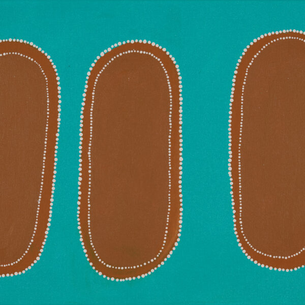 Milinja at 45 (Stepping Stones). This painting is a memory, when we would go out bush for the day, we’d have our dinner down at the river. We’d take our lines and catch fish – we’d catch perch, but we call it Milinja. There’d be a pool of water there, all jumping over the stones to get from one pool to the next. This is just how we grew up. All our families together. We had a few spots, we called it 45 because it was 45km from Roebourne. It’s also known as Njarnduna