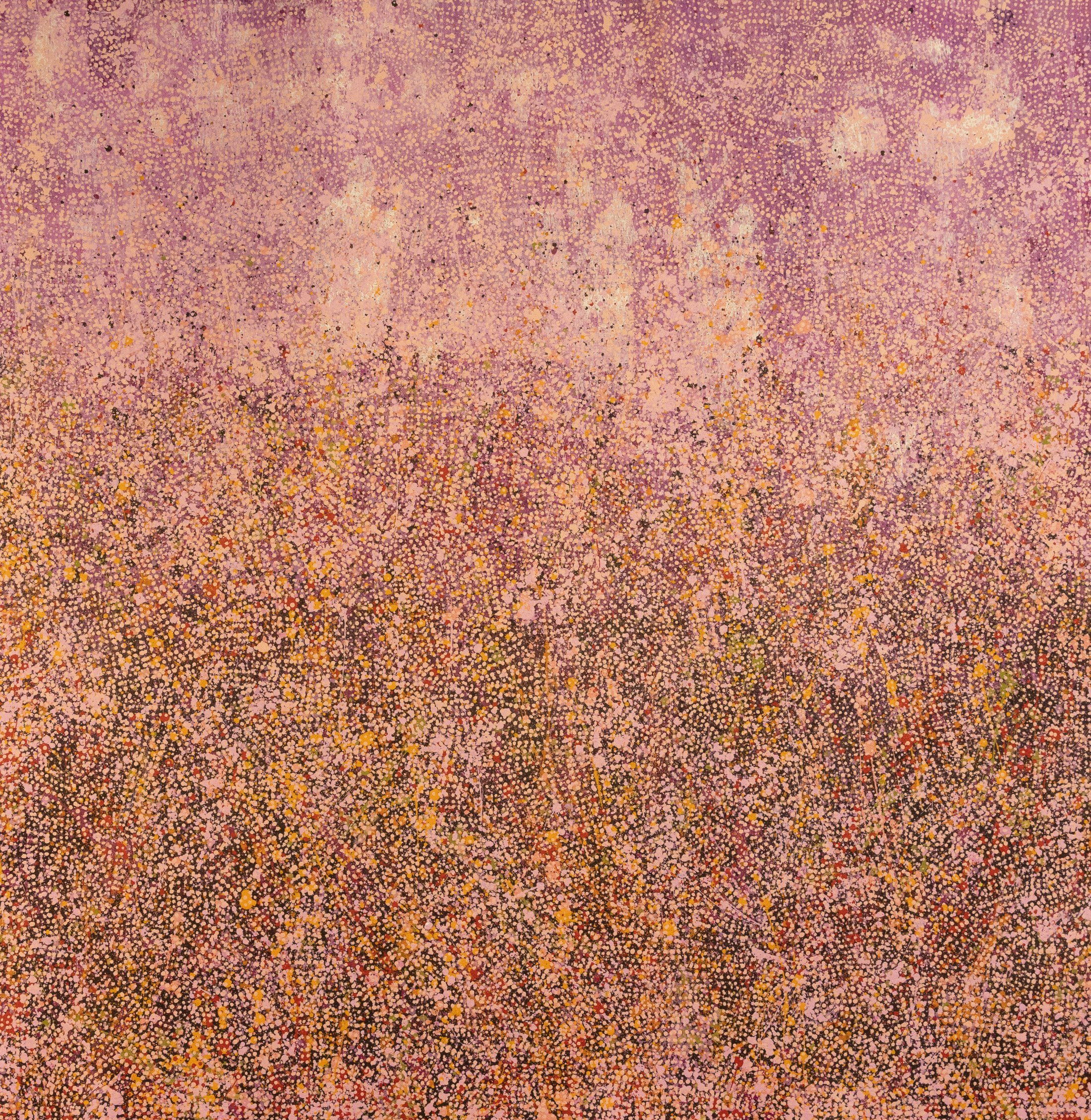 This is the Fortescue Mulla Mulla, Gumbarli in Yindjibarndi language. The flower is a purplish colour. Not a bush medicine, just a flow that grows in the Country, in lines along the roads, everywhere. In this painting, the seeds of the Mulla Mulla are all blowing out. Once the leaves and petals have fallen off, the seeds are flown all through the land to bring flowers again next year. The sturt pea has a vibrant red flower with a black centre piece. It has a succulent sweet juice that can be eaten.