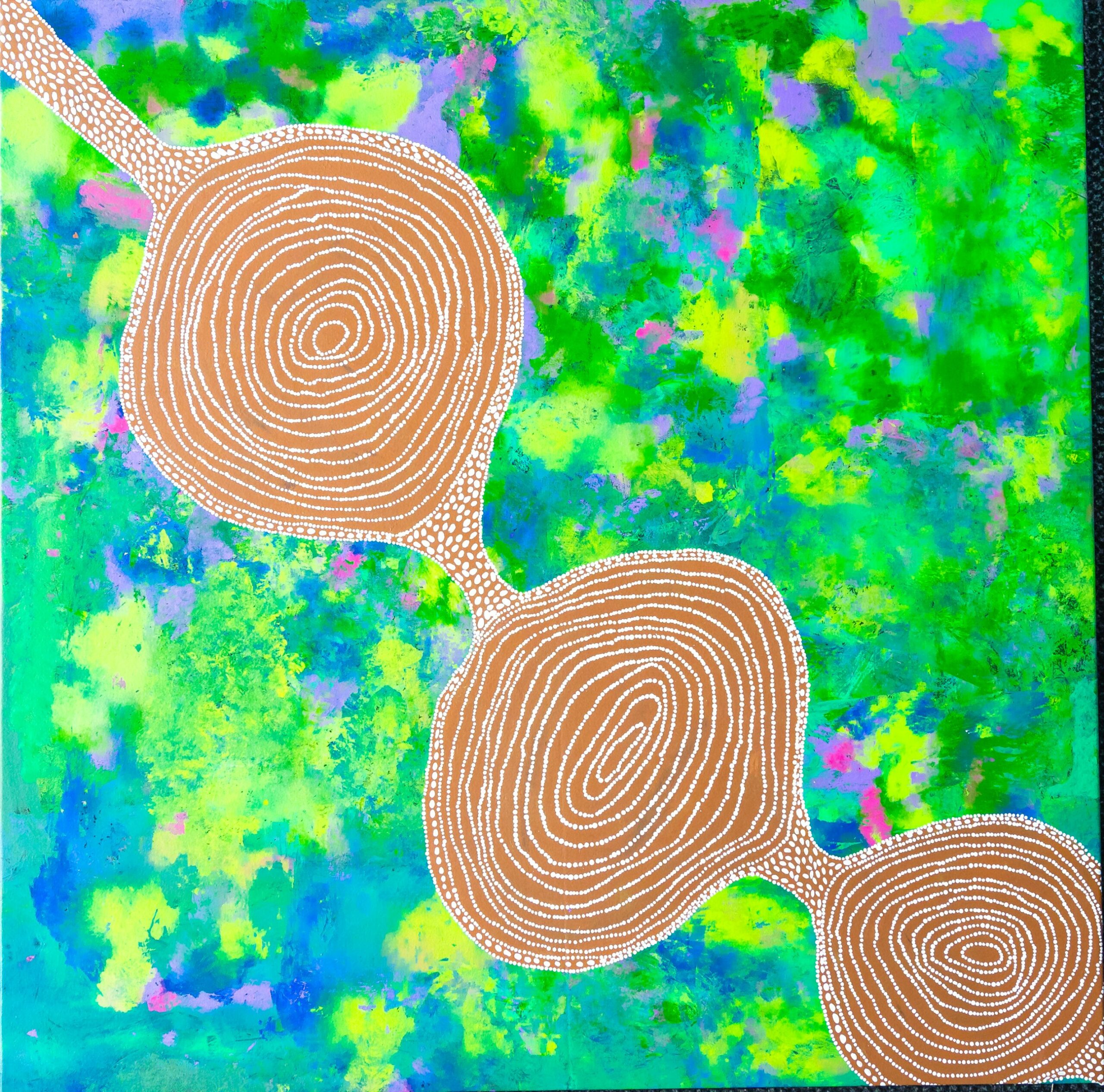 This painting depicts water pools in Thalayindi or Croydon Station, which is in Ngarluma Country. This is my father’s traditional country. My family have a long and sacred association with this place. During the wet season, all the river’s and pools are flowing with water.