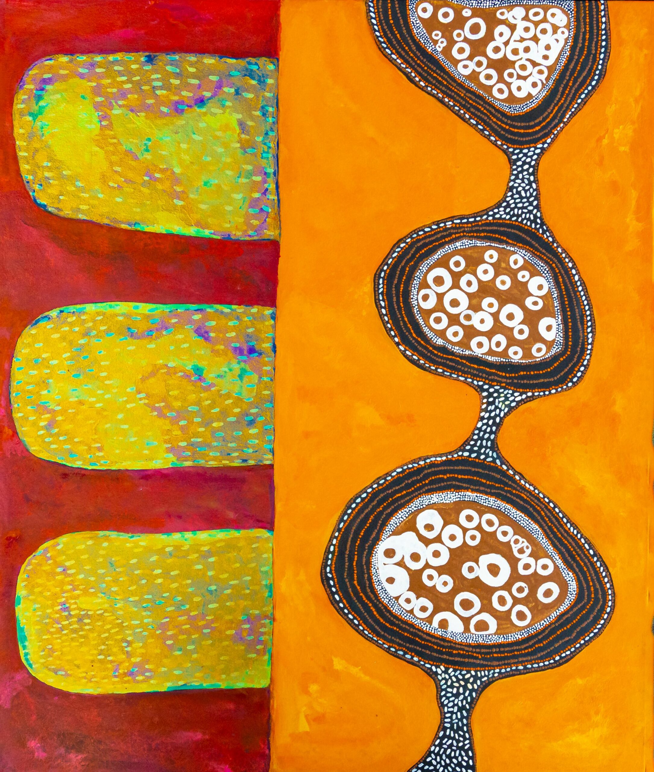 This painting depicts water pools in Thalayindi or Croydon Station, which is in Ngarluma Country. This is my father’s traditional country. My family have a long and sacred association with this place. During the wet season, all the river’s and pools are flowing with water.
