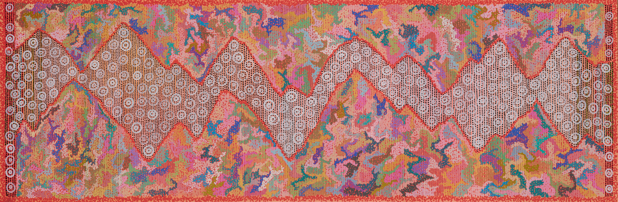 A zig-zag line of Thurru (hills) cuts through Ngurra (Country), each one a guardian holding ancient story and law. The colours around them are the shifting skin of the land—changing with light, season, and time. Walking this path is walking with ancestors, guided by the old songs.