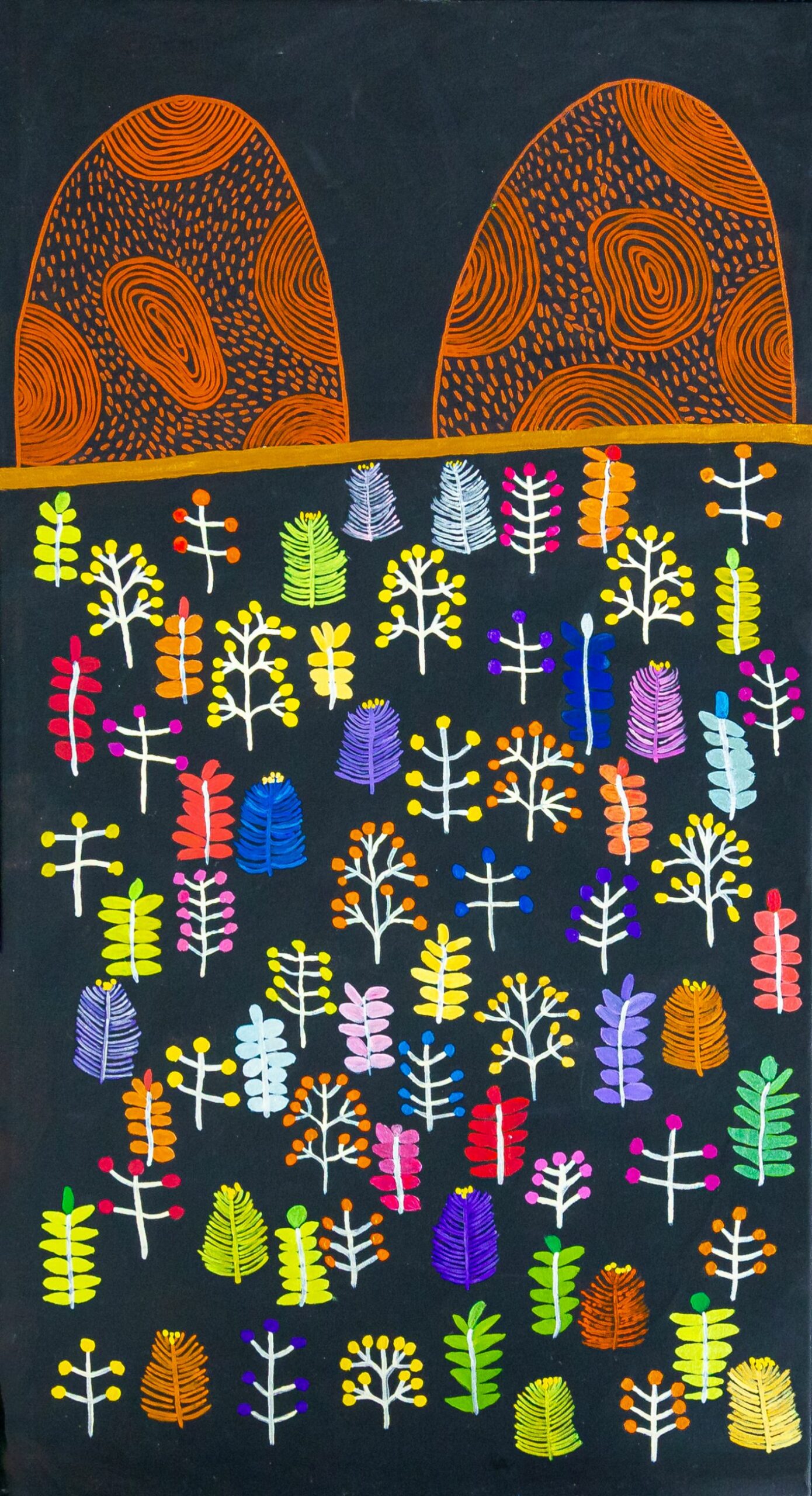 This painting depicts a time when all bush foods and medicinal plants bloom on the Burrup, traditionally known as Mura Juga Country. Mura Juga is well known for having one of the biggest collections of ceremonial rock art in the world. During the wet season all the plants start to bloom. Many traditional owner people still harvest the bush foods and plants with medicinal properties.