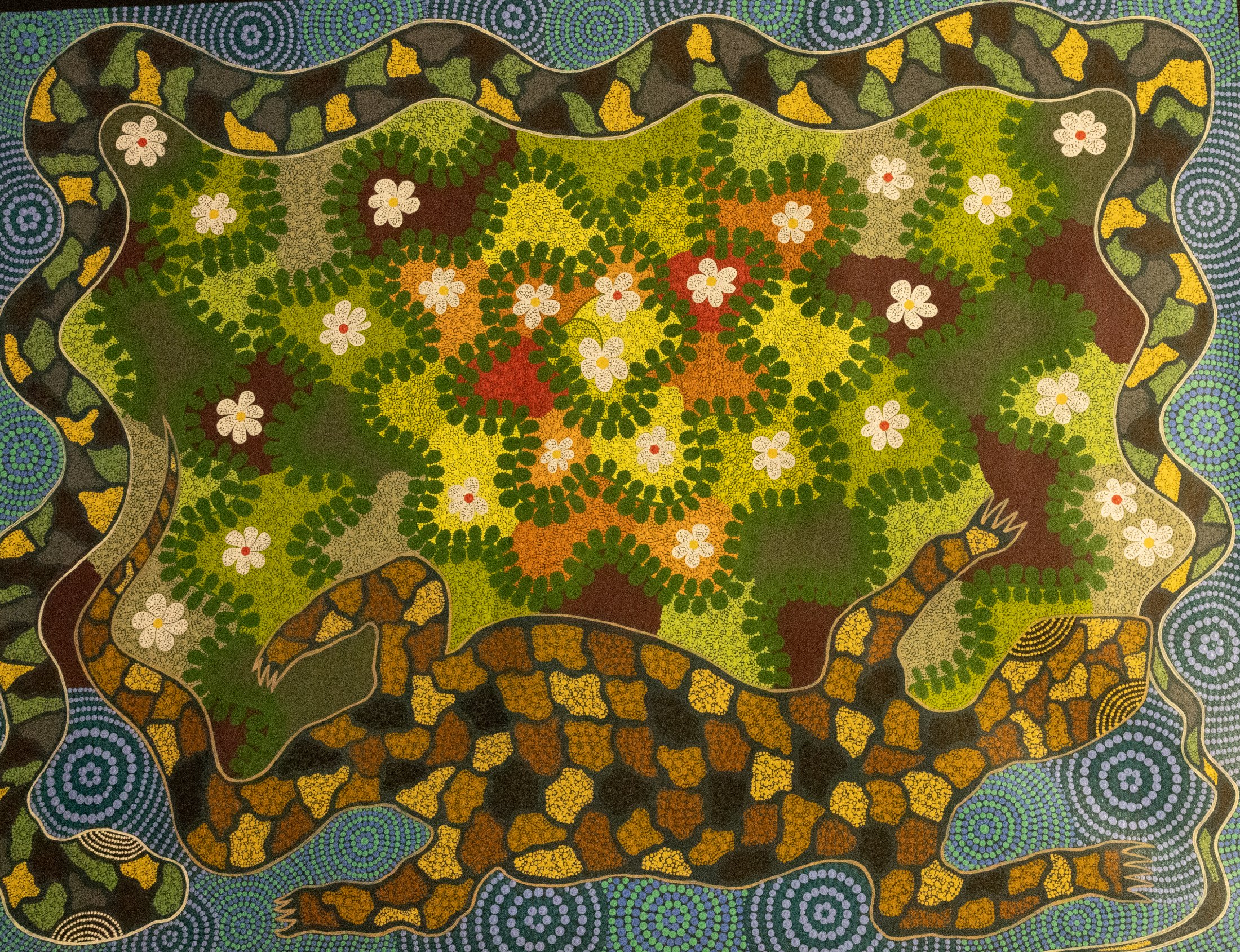 When the Warlu (snake) and the Gurumarnthu (goanna) have a fight and the Warlu bites the Gurumarnthu, the Gurumarnthu goes travelling looking for bush medicine to eat. This medicine helps him to get better from the Warlu poison.