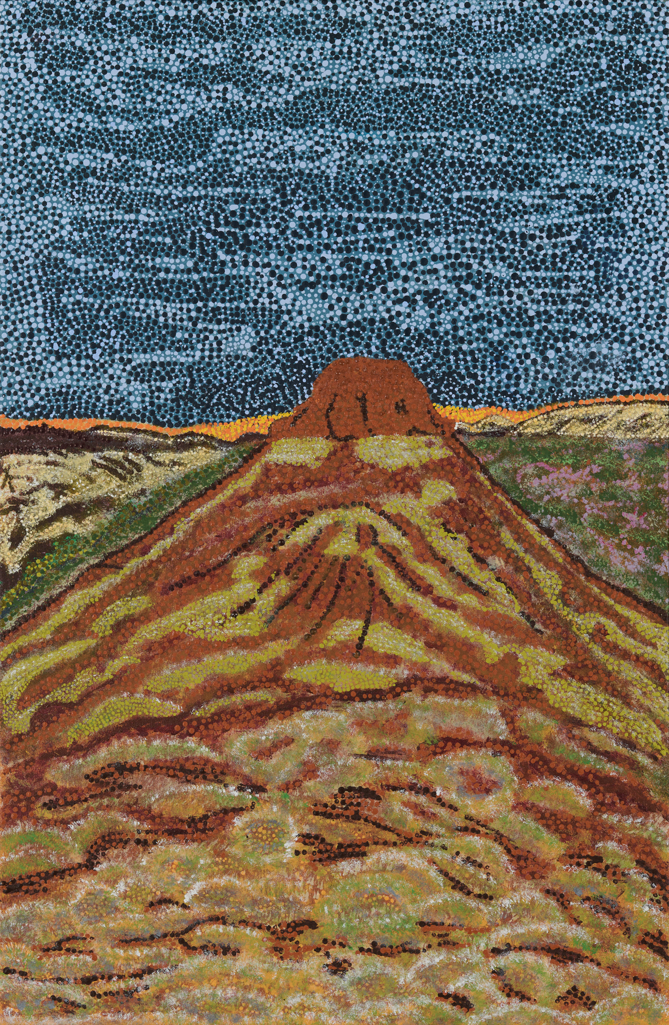 This is a painting of an iconic hill in the Pilbara. You can see it when you drive through the landscape like a marker. Renee Wally paints paints her Pilbara Country and the bush medicine plants she sees when walking. This artwork was created as a collaboration between photographer Christan Fletcher and Justina Willis. Fletcher invited a selection of WA artists to recreate some of his landscape photographs to be displayed together in a joint exhibition held at Linton & Kay galleries in Perth.